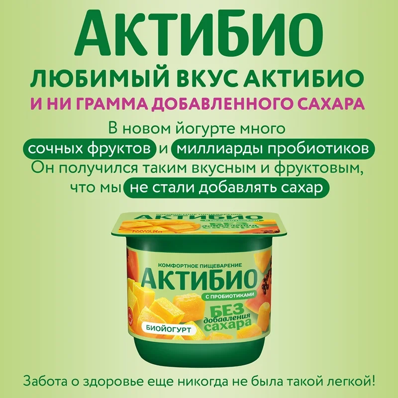 В новом йогурте много сочных ягод, фруктов и миллиарды пробиотиков. Он получился таким вкусным и фруктовым, что мы не стали добавлять сахар.Забота о здоровье еще никогда не была такой лёгкой. Благодаря миллиардам эксклюзивных бифидобактерий биойогурт способствует комфортному пищеварению. Продукт обладает натуральным вкусом молока, манго и папайи, придающих ему освежающие нотки. Прекрасно подходит для перекуса.