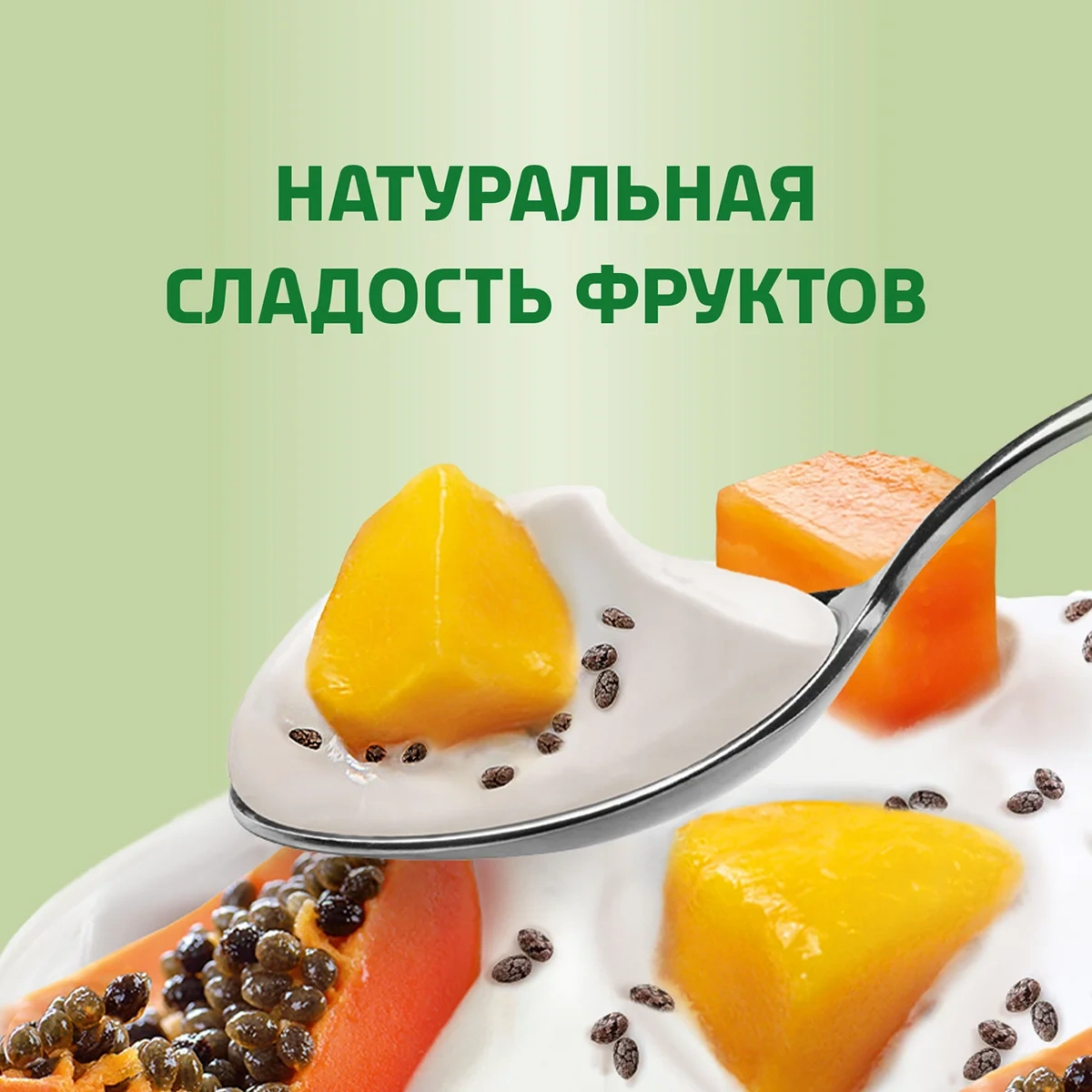 Йогурт со вкусом манго, папайи, винограда и семян чиа без добавления сахара — это настоящая находка для тех, кто следит за своей фигурой. Он отлично подойдет для утреннего завтрака. А также, такой йогурт можно использовать в качестве заправки для гранолы или фруктового салата.
