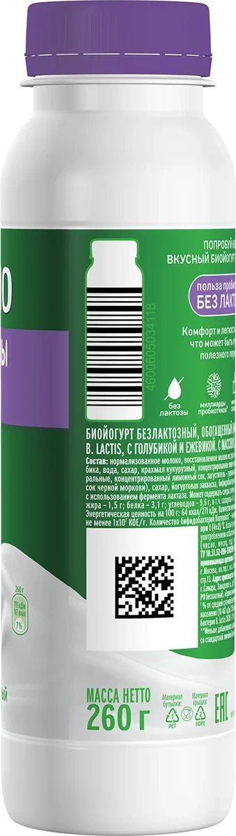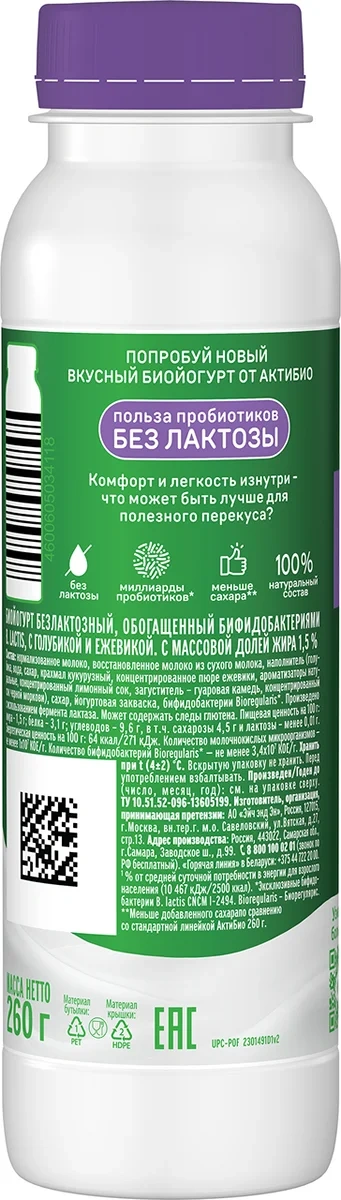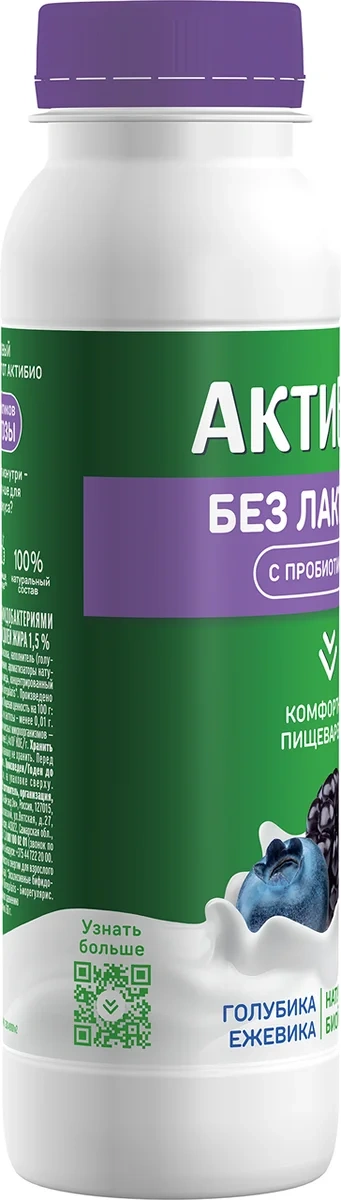 Попробуй новый вкусный биойогурт от АктиБио без лактозы Забота о здоровье начинается с комфортного пищеварения, и с нами это легко! Каждый день наслаждайся нежным и вкусным натуральным биойогуртом АктиБио без лактозы, который прекрасно подходит для полезного перекуса. В нашем новом биойогурте, способствующем комфортному пищеварению, миллиарды эксклюзивных бифидобактерий Bioregularis, меньше сахара и 100% натуральный состав. Комфорт и легкость изнутри - что может быть лучше для полезного перекуса? Содержит менее 0,01г лактозы. Это отличный вариант для завтрака. Ведь такое лакомство содержит белки и сложные углеводы, которые заряжают энергией. А за яркость вкуса отвечает наполнитель с настоящими ягодами: голубикой и ежевикой.