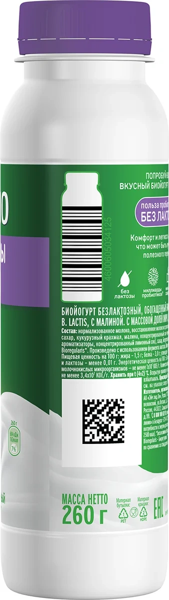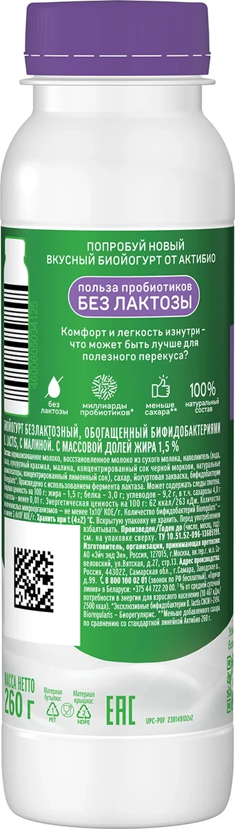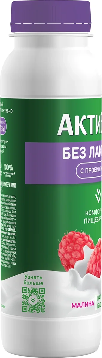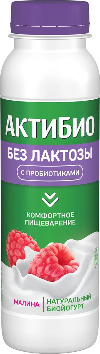 Попробуй новый вкусный биойогурт от АктиБио без лактозы Забота о здоровье начинается с комфортного пищеварения, и с нами это легко! Каждый день наслаждайся нежным и вкусным натуральным биойогуртом АктиБио без лактозы, который прекрасно подходит для полезного перекуса. В нашем новом биойогурте, способствующем комфортному пищеварению, миллиарды эксклюзивных бифидобактерий Bioregularis, меньше сахара и 100% натуральный состав. Комфорт и легкость изнутри - что может быть лучше для полезного перекуса? Содержит менее 0,01г лактозы. Это отборное высококачественное молоко, более нежная и шелковистая консистенция, что делает вкус более богатым и насыщенным, большие кусочки ягод малины.