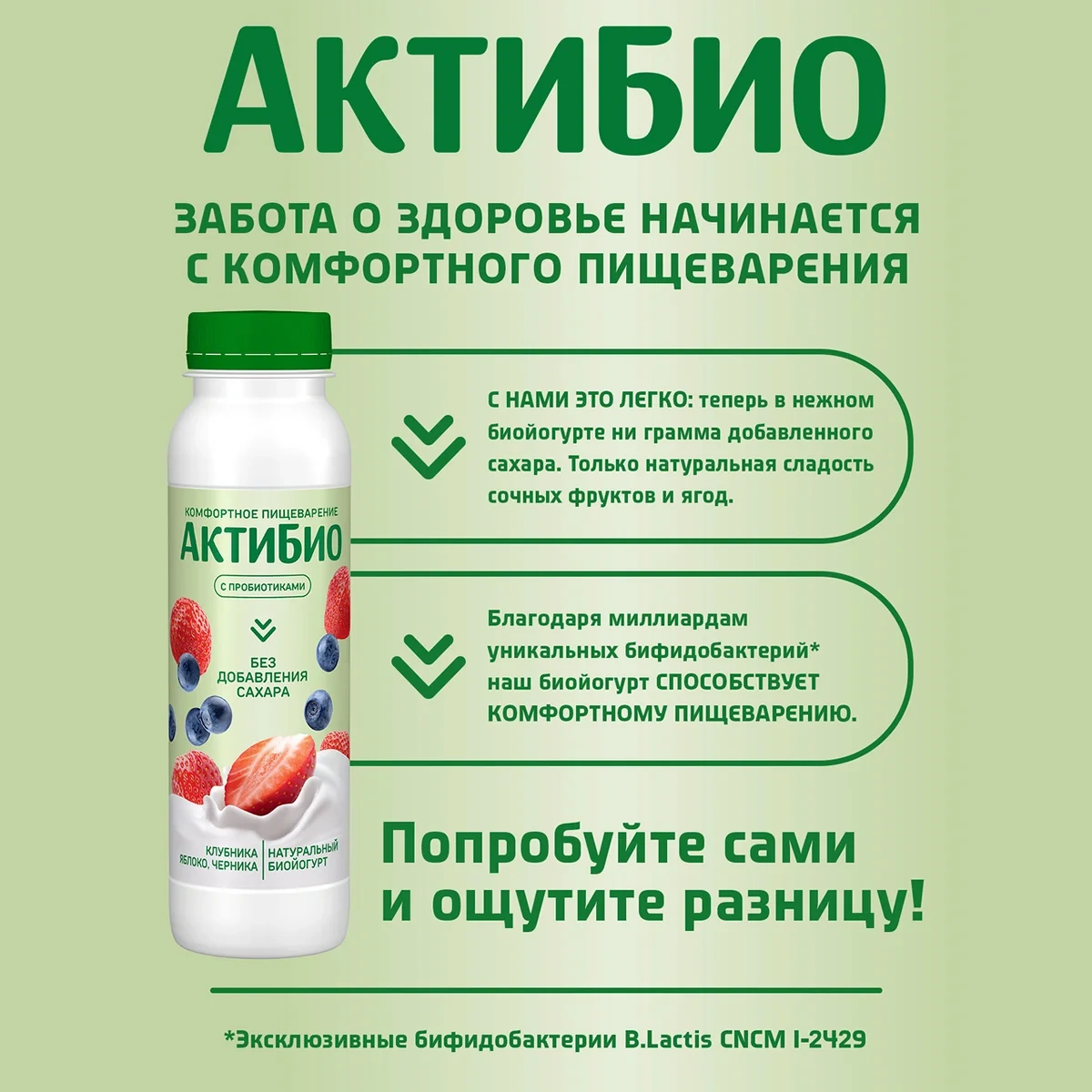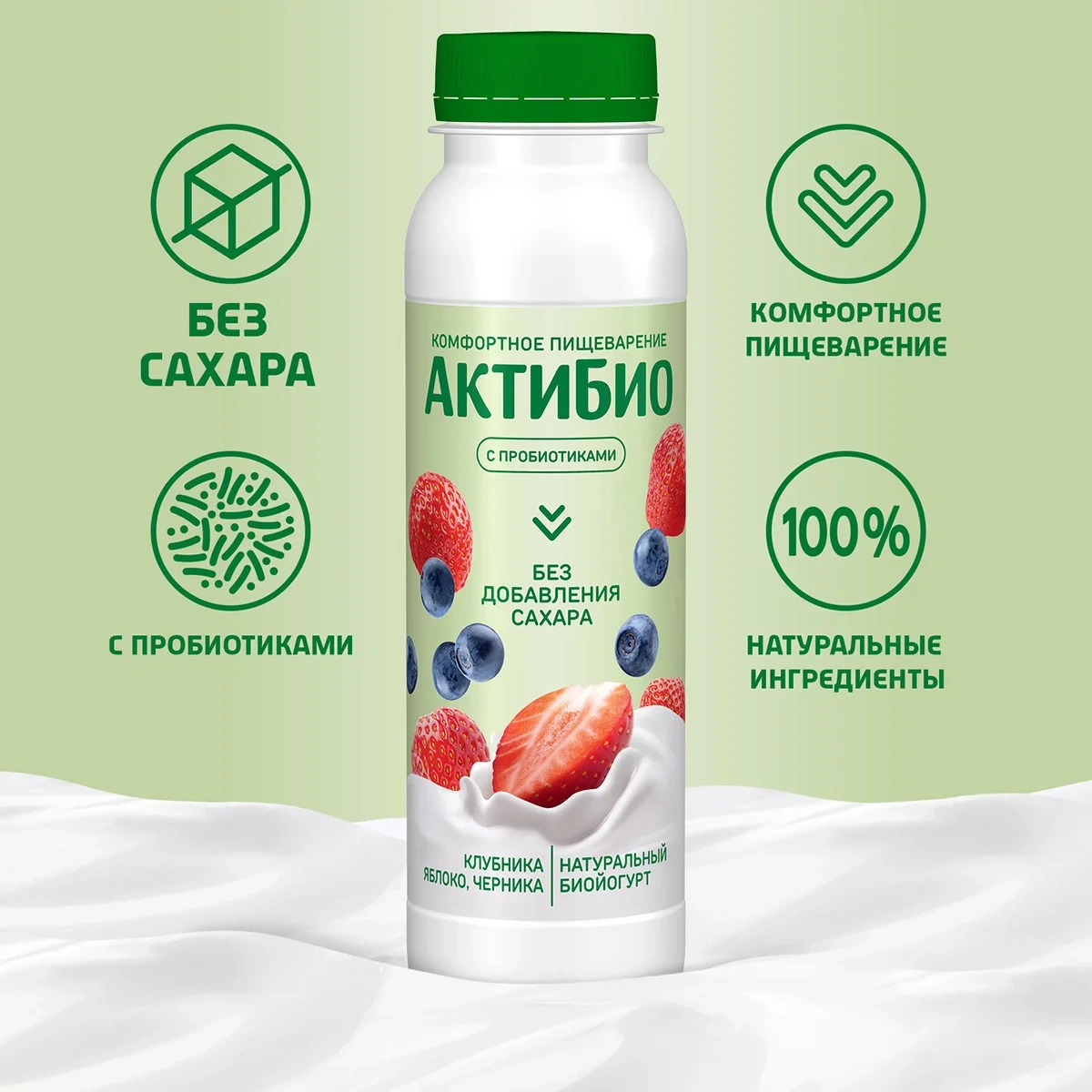 Йогурт питьевой Актибио яблоко-клубника-черника без сахара 1.5%, 260г