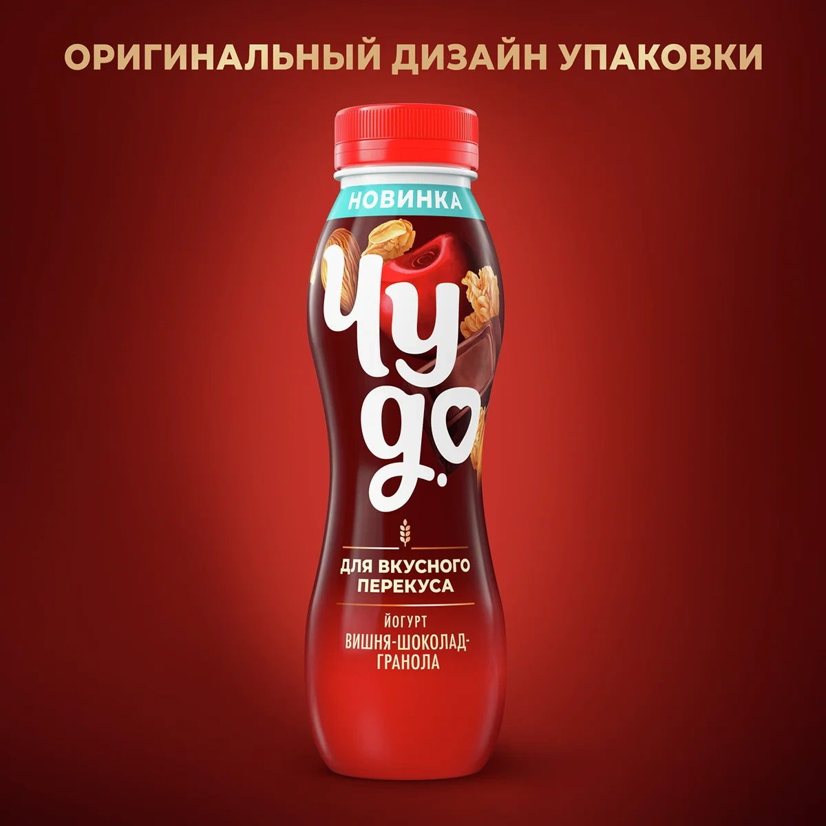 Йогурт Чудо Вишня-шоколад-гранола – питьевой йогурт на основе натурального молока с добавлением злаков. В состав напитка входят зерновые, пшеничные, ячменные и овсяные хлопья, семена чиа, семена льна и миндаль. Йогурт в небольшой бутылочке удобно взять с собой на перекус в течение дня; перед употреблением рекомендуется встряхнуть.