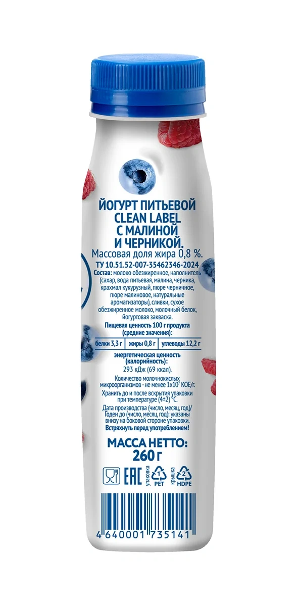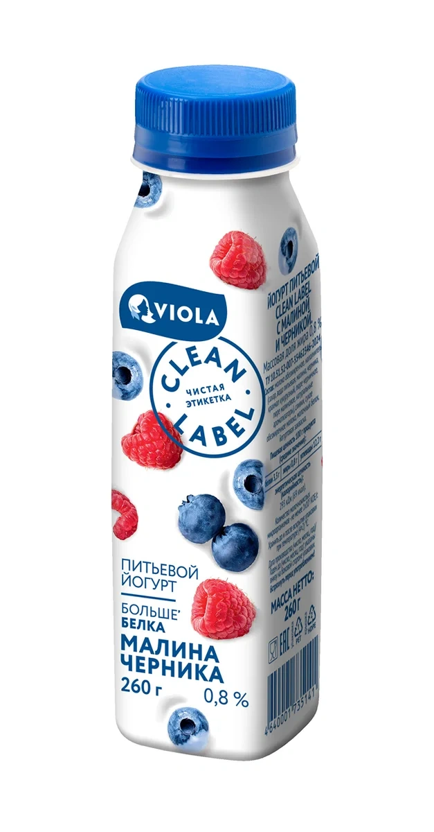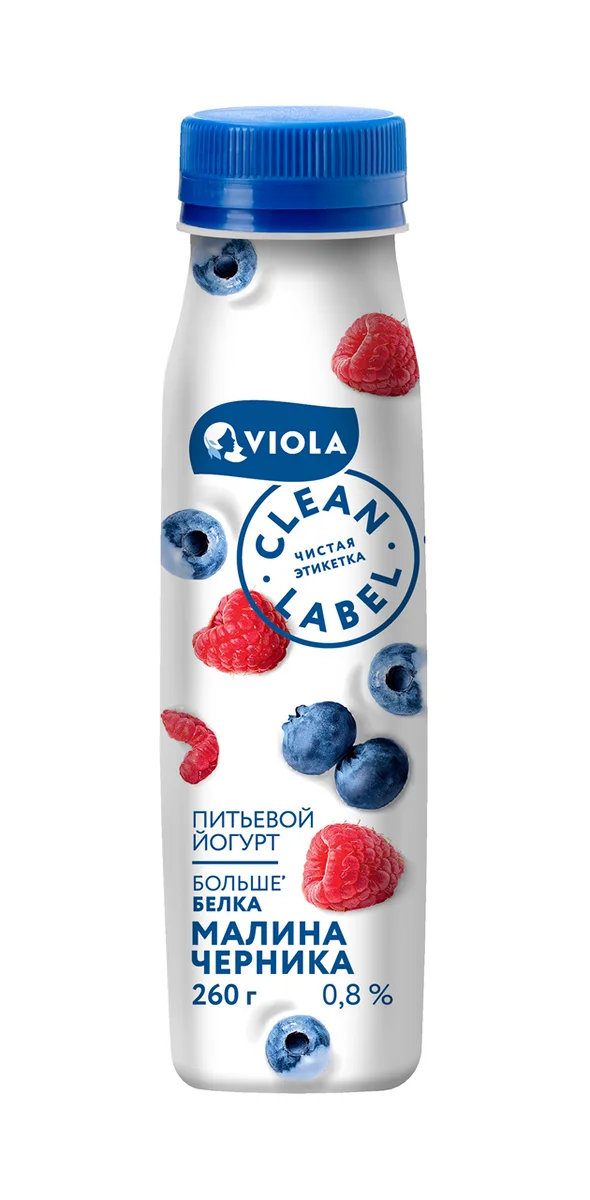 Йогурт питьевой Viola с малиной и черникой 0.8%, 260г - йогурты Viola Clean Label созданы в соответствии с концепцией чистая этикетка, то есть без использования пищевых добавок с Е - кодами. В составе только простые и понятные ингредиенты: молоко, сахар, натуральные фрукты и ягоды, закваска. Также йогурты Viola Clean Label гарантированно не содержат глютен. Для производства йогуртов Viola используется молоко сорта Elite – молоко высочайшего качества от российских молочных хозяйств, прошедших специальную аттестацию компании.
