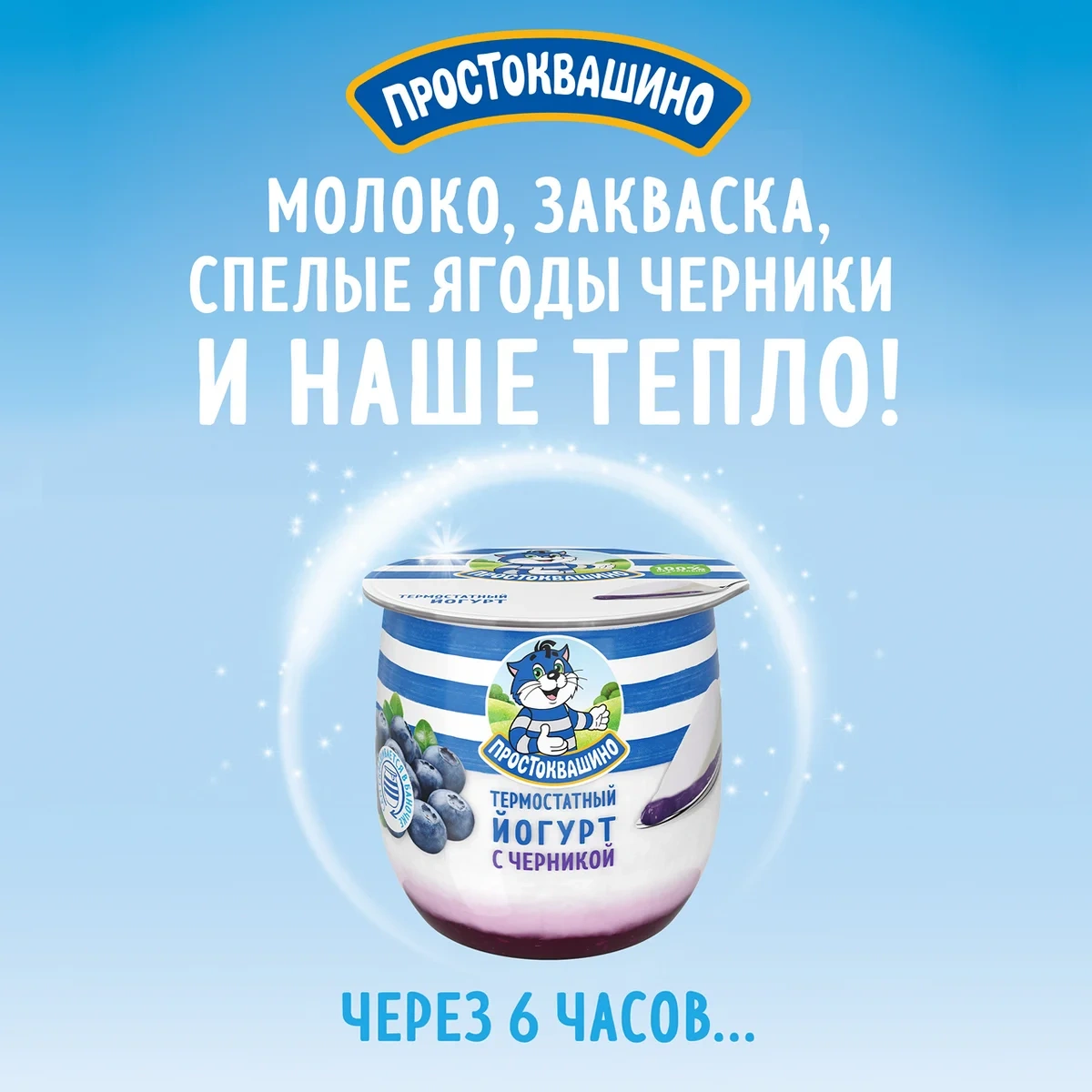 Встречайте термостатный йогурт с черникой от Простоквашино! Два слоя натуральности и вкуса. Верхний - живой йогурт из молока и закваски с уникальной текстурой, созданной живыми бактериями. Нижний - натуральное варенье из спелых ягод карельской черники. Йогурт сам сквашивается прямо в баночке.
