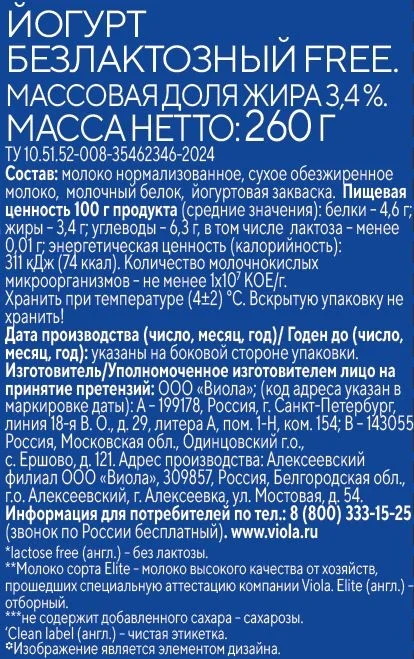 Йогурт Viola безлактозный без сахара 3.4%, 260г