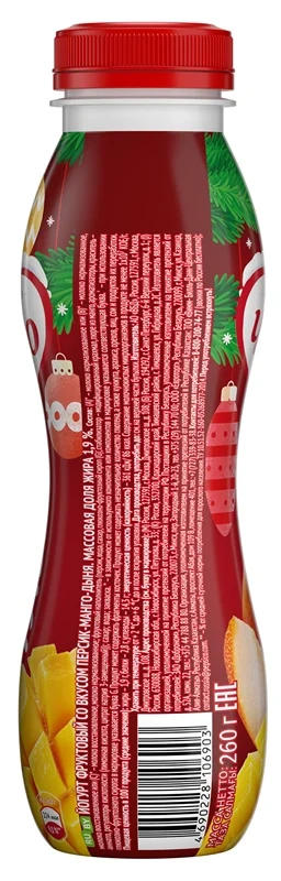 Молоко обезжиренное, вода питьевая, сахар, глюкозно-фруктозный сироп, загустители: дикрахмалфосфат оксипропилированный и пектины; наполнитель (сок персика концентрированный, вода питьевая, ароматизатор, краситель каротины, загуститель дикрахмалфосфат оксипропилированный, краситель кармины, регулятор кислотности цитраты натрия), лактоза, регулятор кислотности молочная кислота, носитель хлорид кальция, закваска.