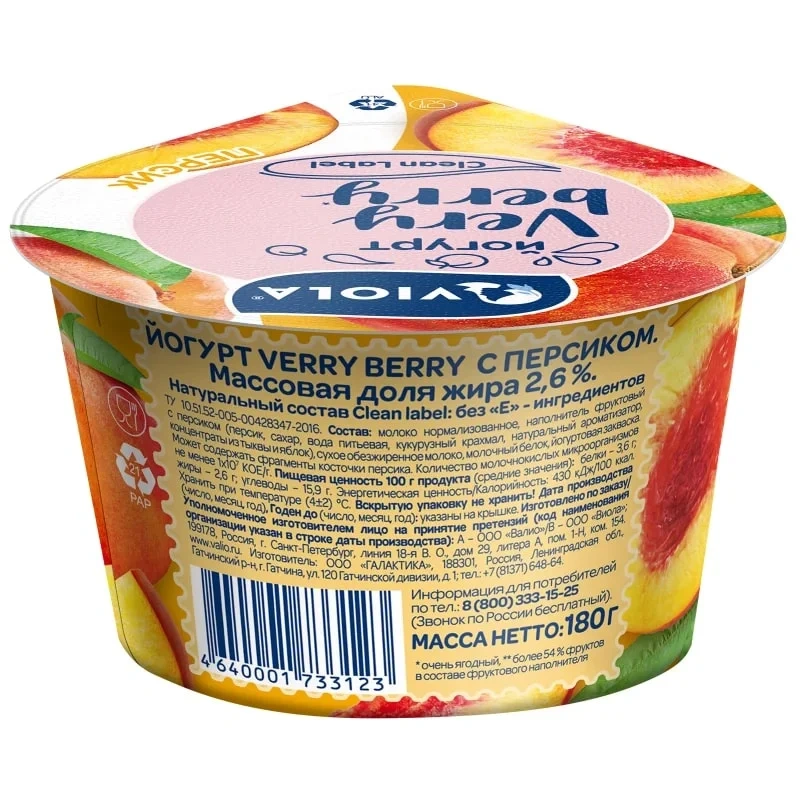 Йогурт Viola Very Berry персик 2.6%, 180г