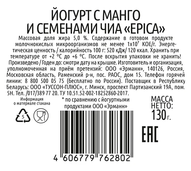 Йогурт Epica манго и семена чиа, 5%, 130г