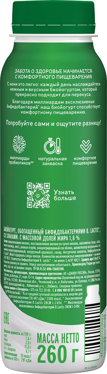 Йогурт питьевой Актибио Злаки, 1.6%, 260г