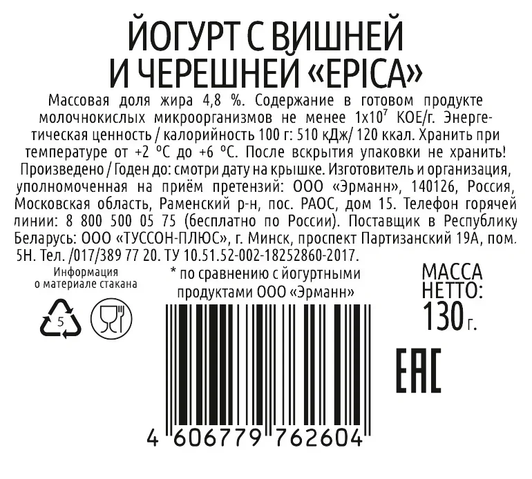 Йогурт Epica вишня и черешня, 4.8%, 130г