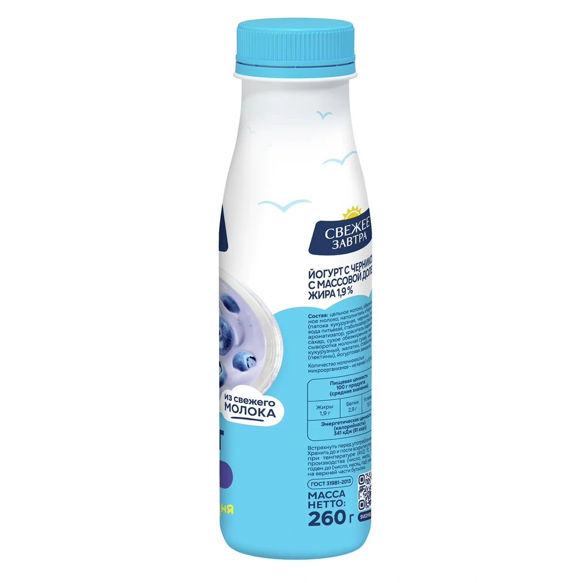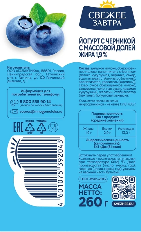 Йогурт Свежее завтра черника ГОСТ 1.9%, 260г