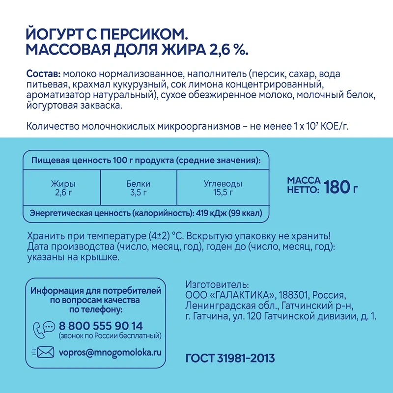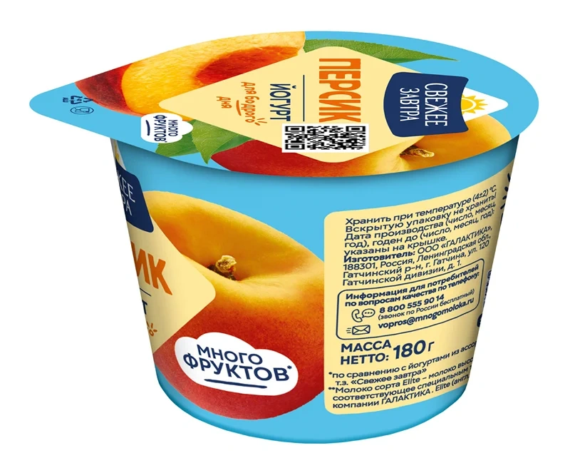 Йогурт Свежее завтра с персиком 2.6%, 180г