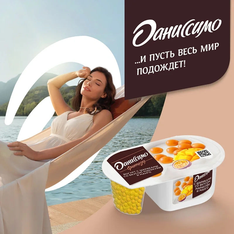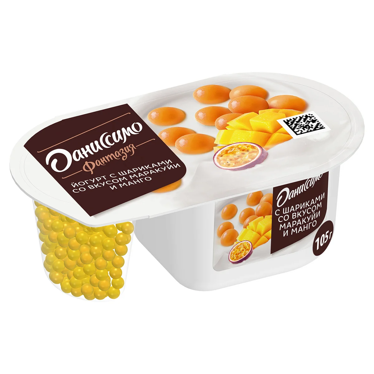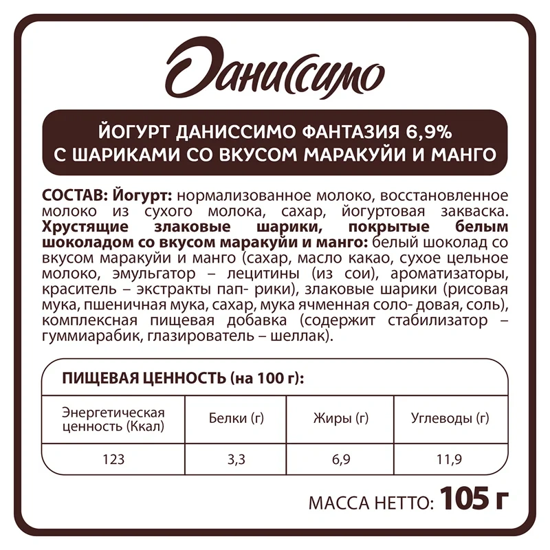 Йогурт Даниссимо Фантазия с хрустящими шариками со вкусом манго и маракуйи 6.9%, 105г