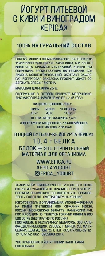 Йогурт питьевой Epica киви виноград 2.5%, 260г