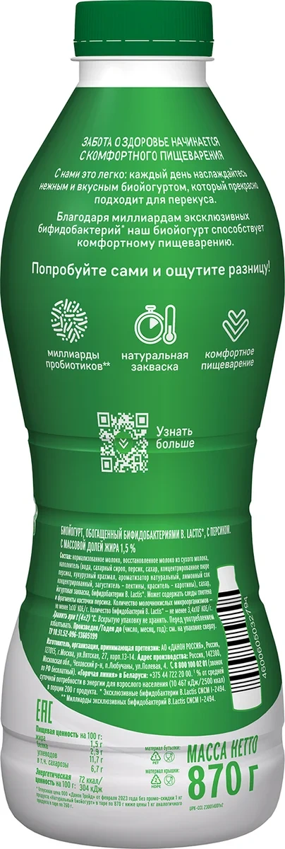 Йогурт питьевой Актибио персик 1.5%, 870г