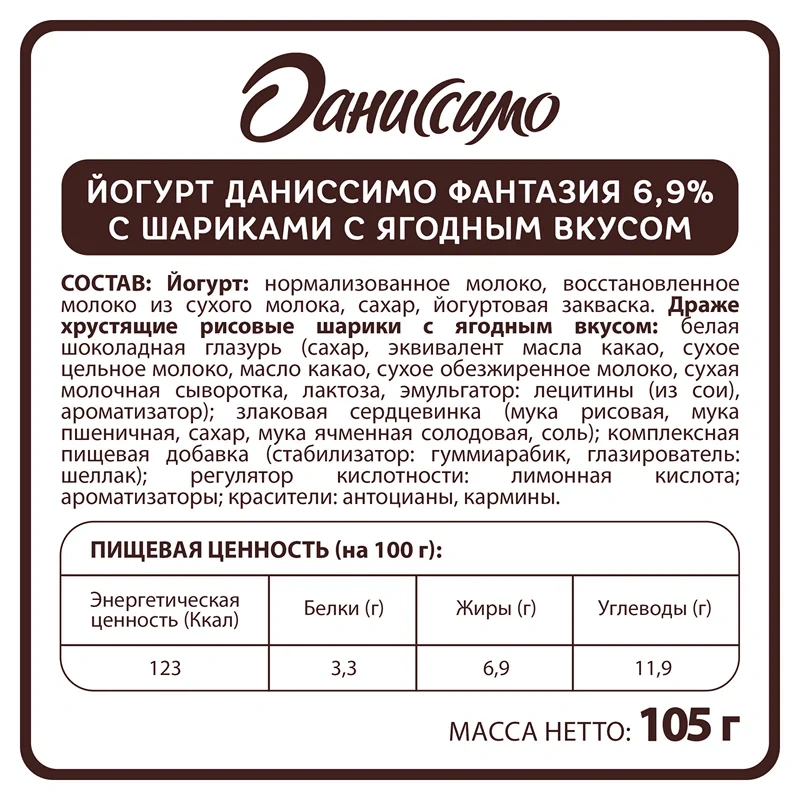 Йогурт Даниссимо Фантазия шарики с ягодами, 6.9%, 105г