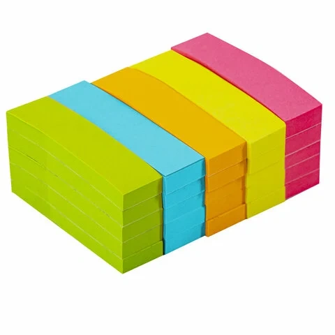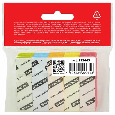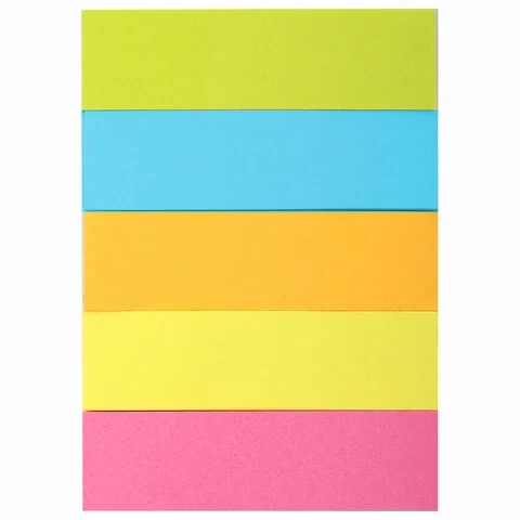Комплект содержит 5 наборов бумажных закладок по 5 неоновых цветов размером 50х14 мм, состоит из 1250 листов, по 250 закладок каждого цвета. Клейкий слой - 22 Н/м. Легко клеятся к любой поверхности и не оставляют следов. Материал закладок позволяет делать надписи ручкой и карандашом. Поставляются в полиэтиленовом пакете с европодвесом.
