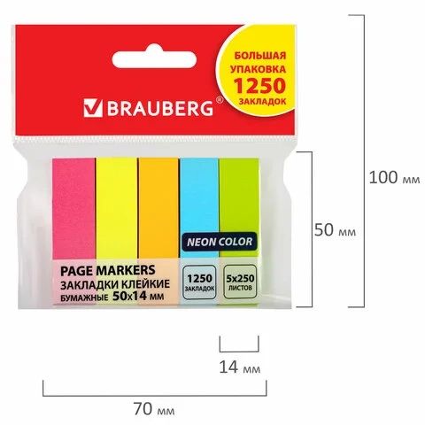 Клейкие закладки бумажные Brauberg 50х14мм, 5 цветов х 50 листов, неновые