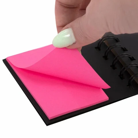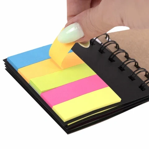 Легко клеятся к любой поверхности и не оставляют следов. Материал закладок и блоков позволяет делать надписи ручкой и карандашом. Уложены в картонной книжке на спирали и упакованы в полиэтиленовый пакет с европодвесом.