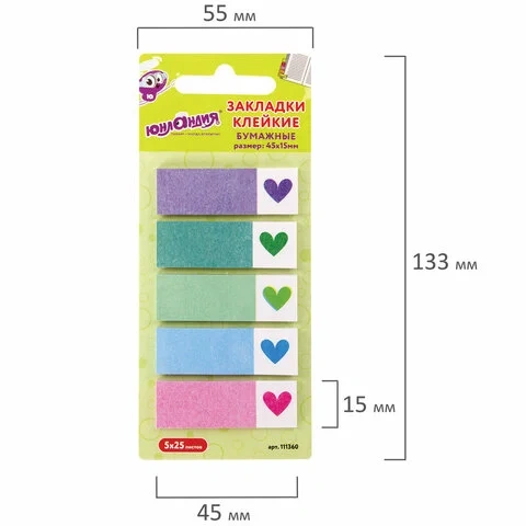 В наборе по 25 закладок каждого из 5 цветов. Размер закладки: 45х15 мм. Клейкий слой - 32 Н/м. Материал закладок позволяет делать на них надписи ручкой или карандашом. Поставляются в полиэтиленовом пакете с европодвесом.