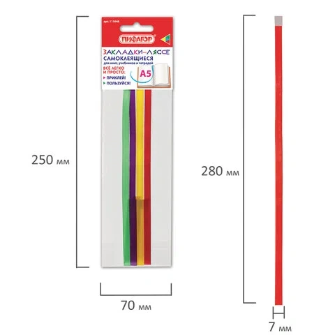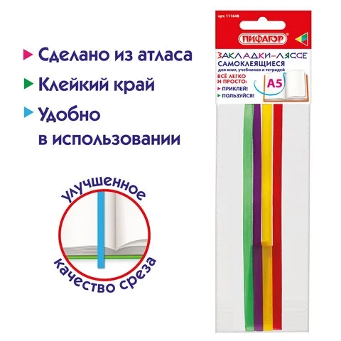 Закладки-ляссе 'РАДУГА' для книг А5 (длина 28 см) ПИФАГОР, клейкий край, 4 ленты, 111648