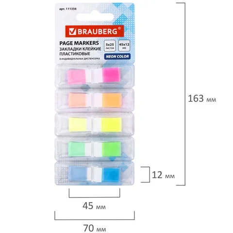 Закладки клейкие BRAUBERG НЕОНОВЫЕ пластиковых в диспенсерах, 45х12 мм, 5 цветов х 25 листов, 111356