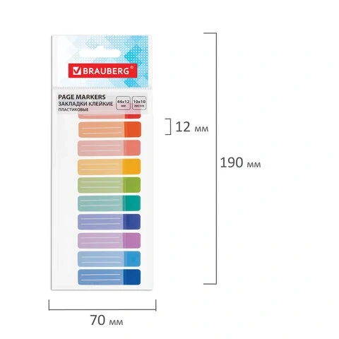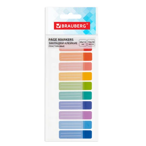 Клейкие закладки пластиковые Brauberg 10 цветов, 44х12мм, 100шт, на пластиковой линейке