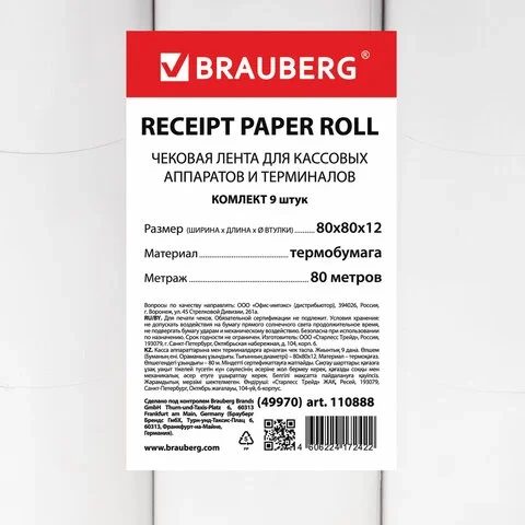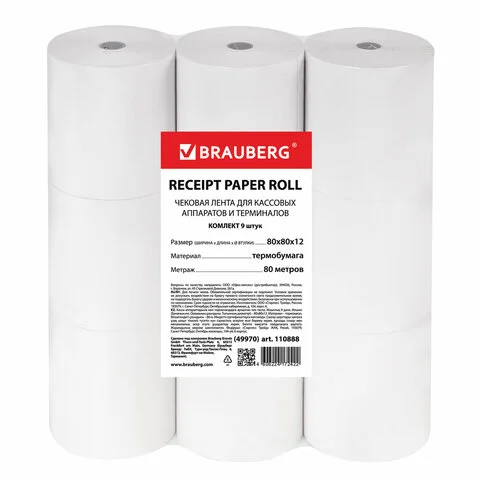 Ролик для касс Brauberg термо d=12мм, 80мм х 80м, 9шт
