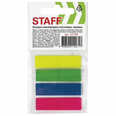 Клейкие закладки пластиковые Staff 12х45мм, 4цвета по 25 листов, неон