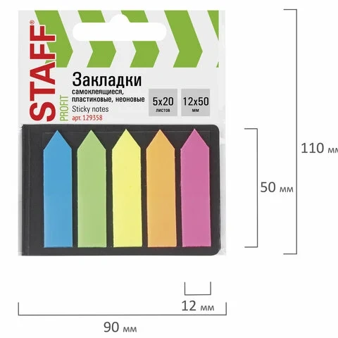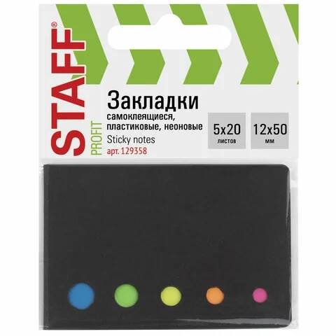 Клейкие закладки пластиковые Staff Неоновые 50х12мм, 5 цветов по 20 листов