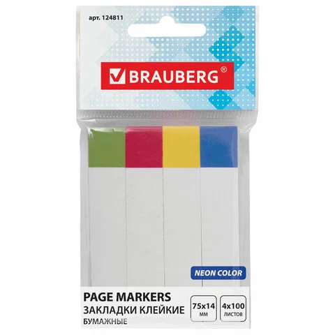 Клейкие закладки бумажные Brauberg 75х14мм, 4цвета по 100 листов