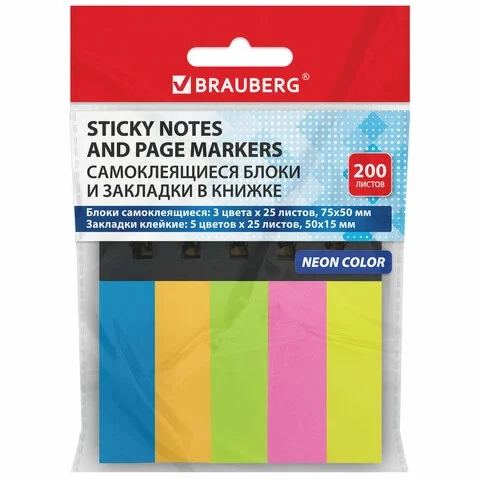 Клейкие закладки бумажные Brauberg 5 цветов, 50х15мм х 5 цветов, 75х50мм х 3 цвета, 125 листов