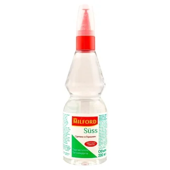 Подсластитель Milford жидкий, 200 мл – превосходная альтернатива обычному сахару. Продукт отличается низкой калорийностью, что немаловажно при похудении и приверженности здорового питания. Концентрация и сочетание компонентов подобраны таким образом, что небольшое количество жидкости способно заменить ложку сахарного песка или кусочек сахара рафинада. Благодаря удобному формату можно без труда определить необходимую дозировку. Продукт растворяется в напитки в считаные секунды. Вкус при этом максимально приближен к сахару. В качестве основы для производства используются растительные компоненты, благодаря чему готовый продукт подходит как для диетического, так и для диабетического питания.