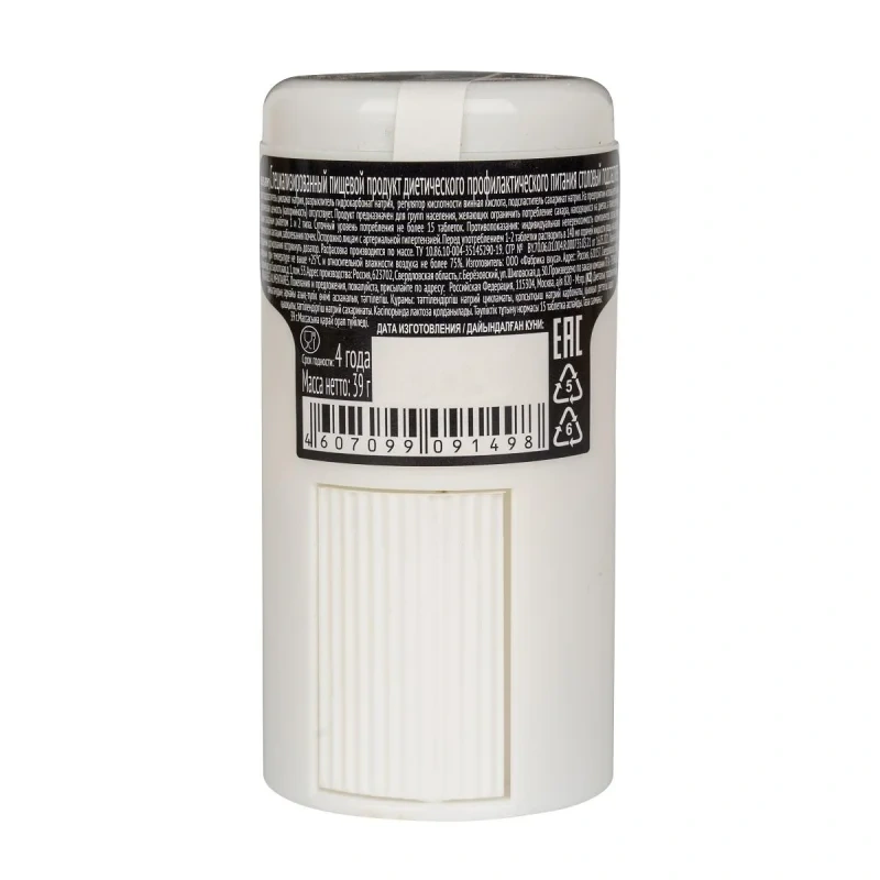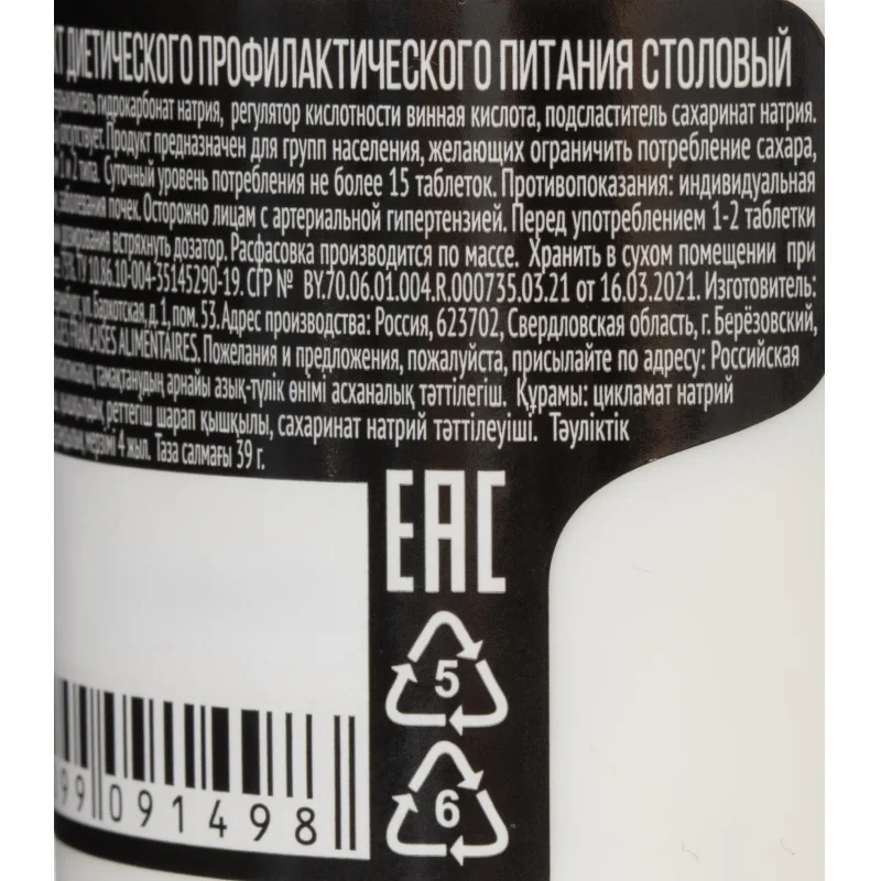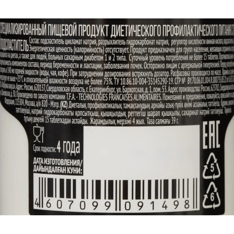 Основой сахарозаменителя Maitre de Sucre являются сахарин и цикламат. Предназначен для добавления в напитки и блюда, подходит для диетического питания. Каждая из 650 таблеток заменяет одну чайную ложку сахара (5 гр.). Пластиковая упаковка снабжена дозатором.