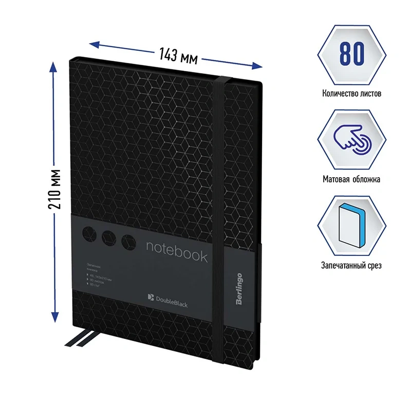 Стильные записные книжки Berlingo 'DoubleBlack' с полужесткой обложкой из высококачественного soft-touch кожзаменителя с черным срезом. Вертикальная фиксирующая резинка увеличенной толщины 9мм. Цвет обложки - черный. Имиджевый рисунок лаком по всей площади обложки. Внутренний карман для хранения заметок и мелочей. Внутренний блок из 80 листов высокачественной кремовой бумаги повышенной плотности 80 г/м. Перфорированные уголки блока. 2 закладки-ляссе. Прошитый блок. Подходит под персонализацию.