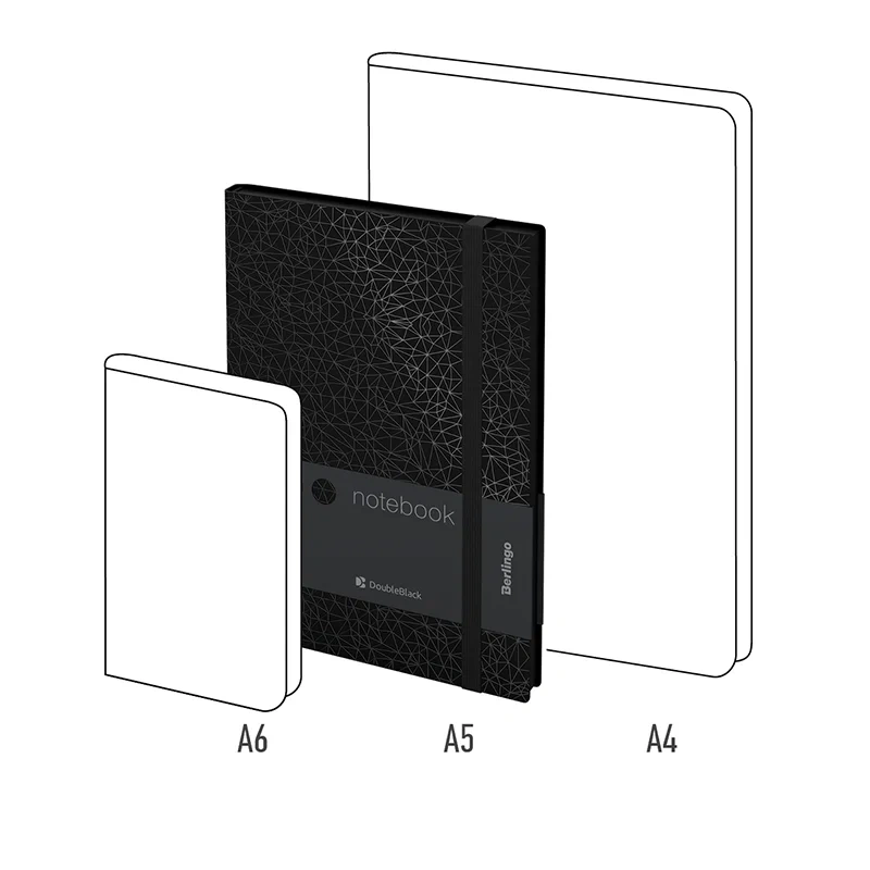 Стильные записные книжки Berlingo 'DoubleBlack' с полужесткой обложкой из высококачественного soft-touch кожзаменителя с черным срезом. Вертикальная фиксирующая резинка увеличенной толщины 9мм. Цвет обложки - черный. Имиджевый рисунок лаком по всей площади обложки. Внутренний карман для хранения заметок и мелочей. Внутренний блок из 80 листов высокачественной кремовой бумаги повышенной плотности 80 г/м. Перфорированные уголки блока. 2 закладки-ляссе. Прошитый блок. Подходит под персонализацию.