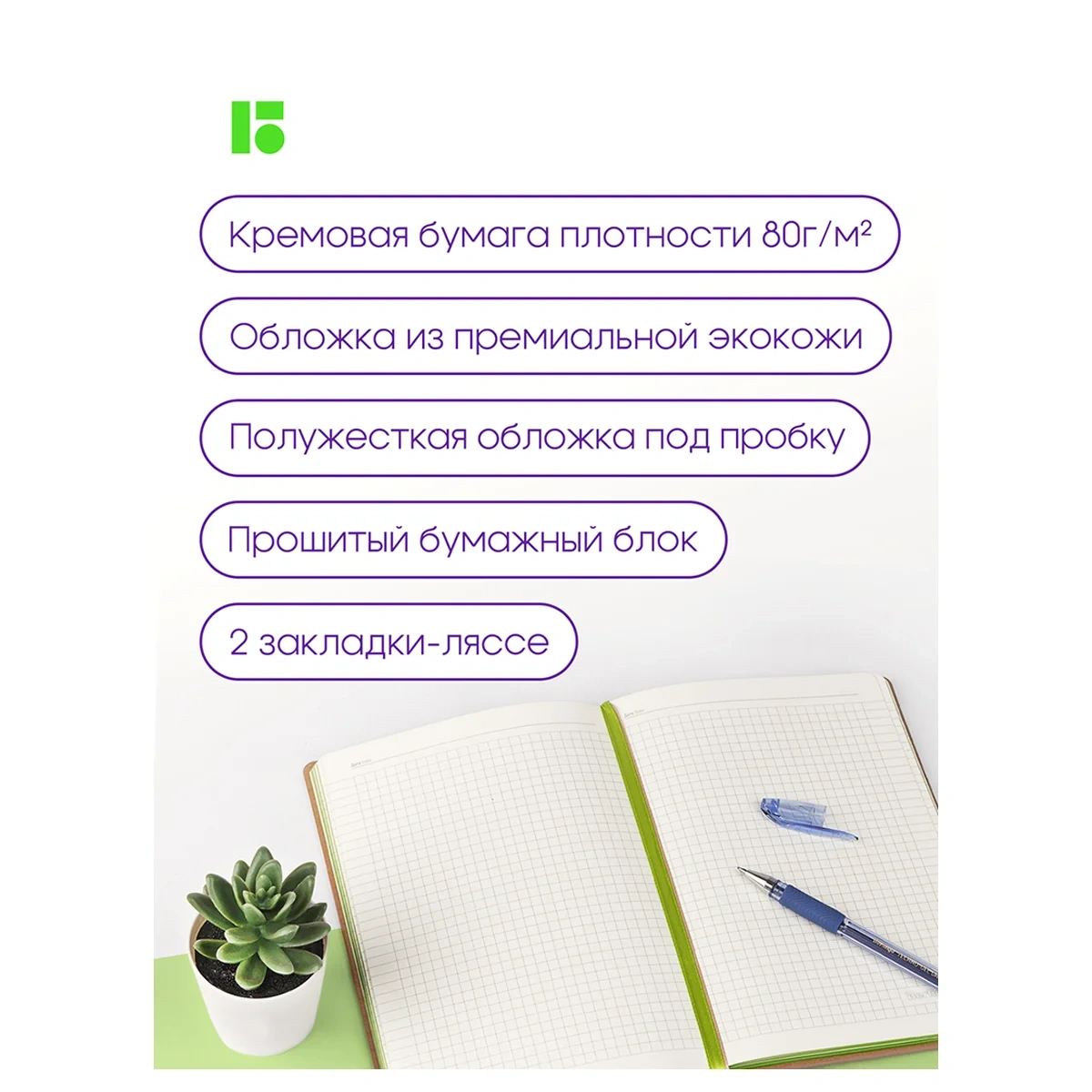 Записная книжка Berlingo Green Series формата A5 с зеленым контрастным срезом и обложкой из высококачественной экокожи, стилизованной под пробковый материал. Полужесткая обложка. Внутренний блок состоит из 80 листов высококачественной кремовой бумаги повышенной плотности 80 г/м? с пантонной печатью в 2 краски. Представлена в размере 143 на 210 мм.