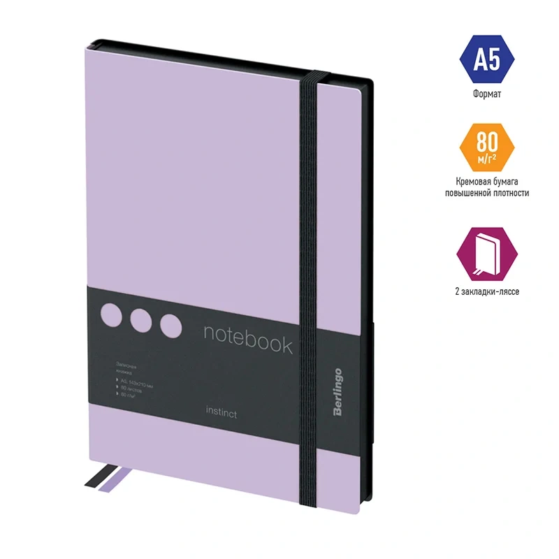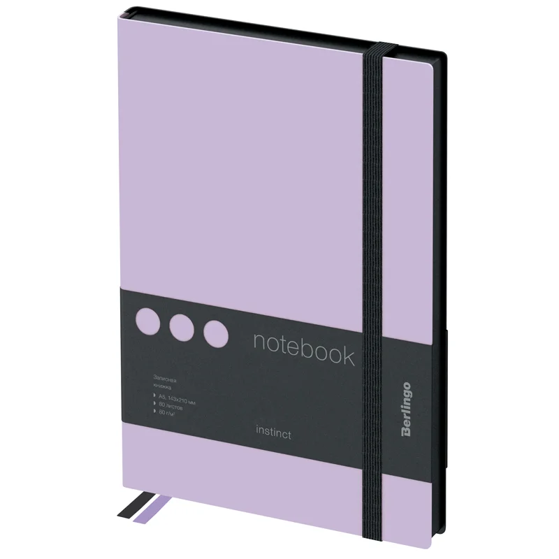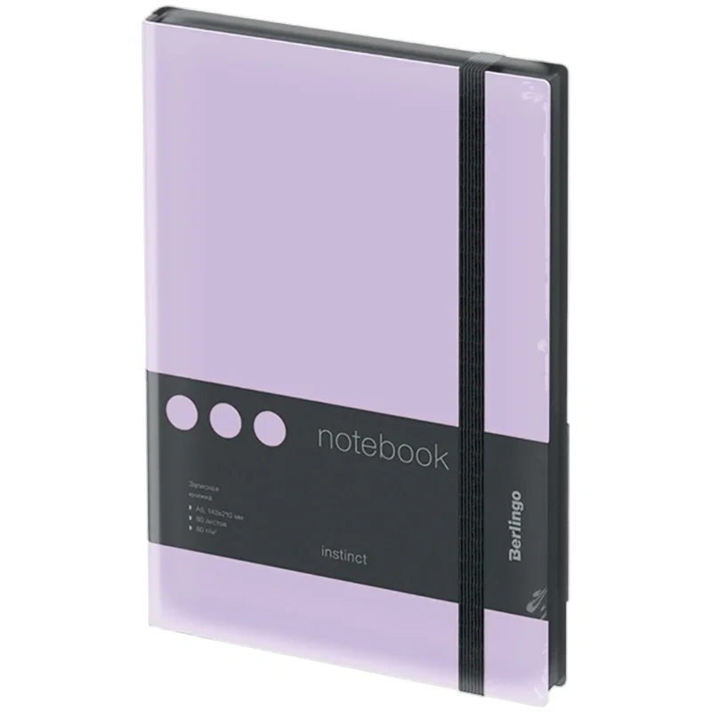 Стильная записная книжка Berlingo Instinct формата А5 с первого взгляда поражает мягкой обложкой из матовой экокожи c эффектом soft-touch и резинкой увеличенной ширины 9 мм. Сочетание пастельного лавандового цвета и лаконичного черного среза придает записной книжке индивидуальность. Прошитый внутренний блок из 80 листов кремовой бумаги повышенной плотности 80 г/м? имеет перфорированные уголки и линовку в клетку. Записная книжка Berlingo Instinct подходит под персонализацию, внутри 2 удобные закладки-ляссе и запечатанные форзацы. В подарок – 3 комплекта стикеров с латинским, русским алфавитом и пиктограммами. Записная книжка представлена в размере 143*210 мм.