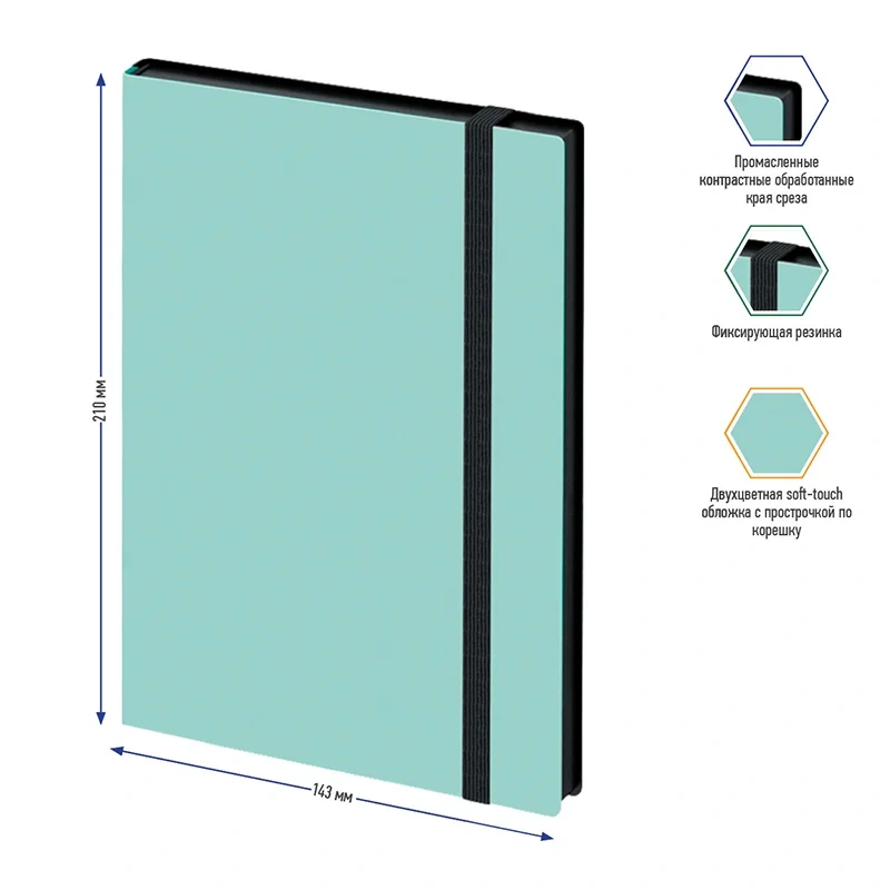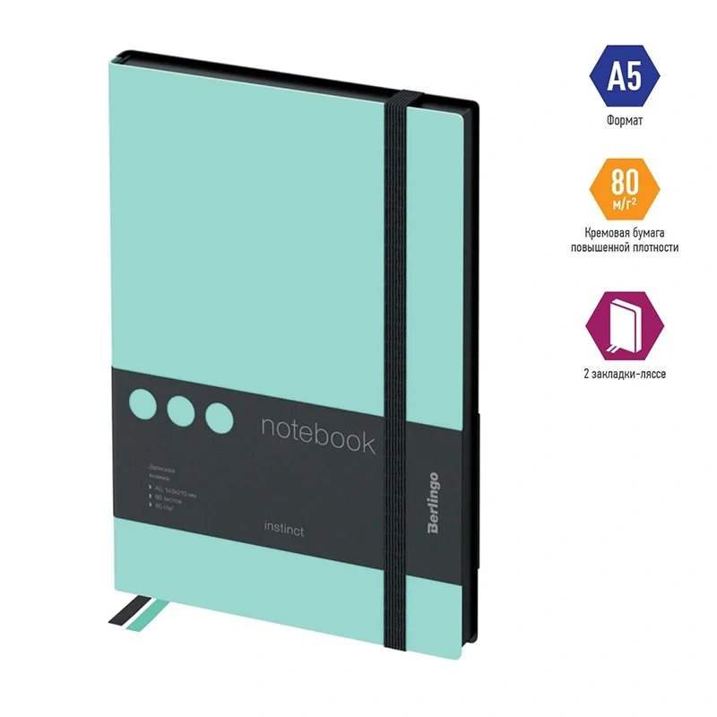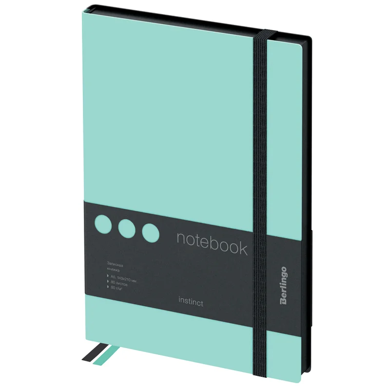 Стильная записная книжка Berlingo Instinct формата А5 с первого взгляда поражает мягкой обложкой из матовой экокожи c эффектом soft-touch и резинкой увеличенной ширины 9 мм. Сочетание пастельного мятного цвета и лаконичного черного среза придает записной книжке индивидуальность. Прошитый внутренний блок из 80 листов кремовой бумаги повышенной плотности 80 г/м? имеет перфорированные уголки и линовку в клетку. Записная книжка Berlingo Instinct подходит под персонализацию, внутри 2 удобные закладки-ляссе и запечатанные форзацы. В подарок – 3 комплекта стикеров с латинским, русским алфавитом и пиктограммами. Записная книжка представлена в размере 143*210 мм.