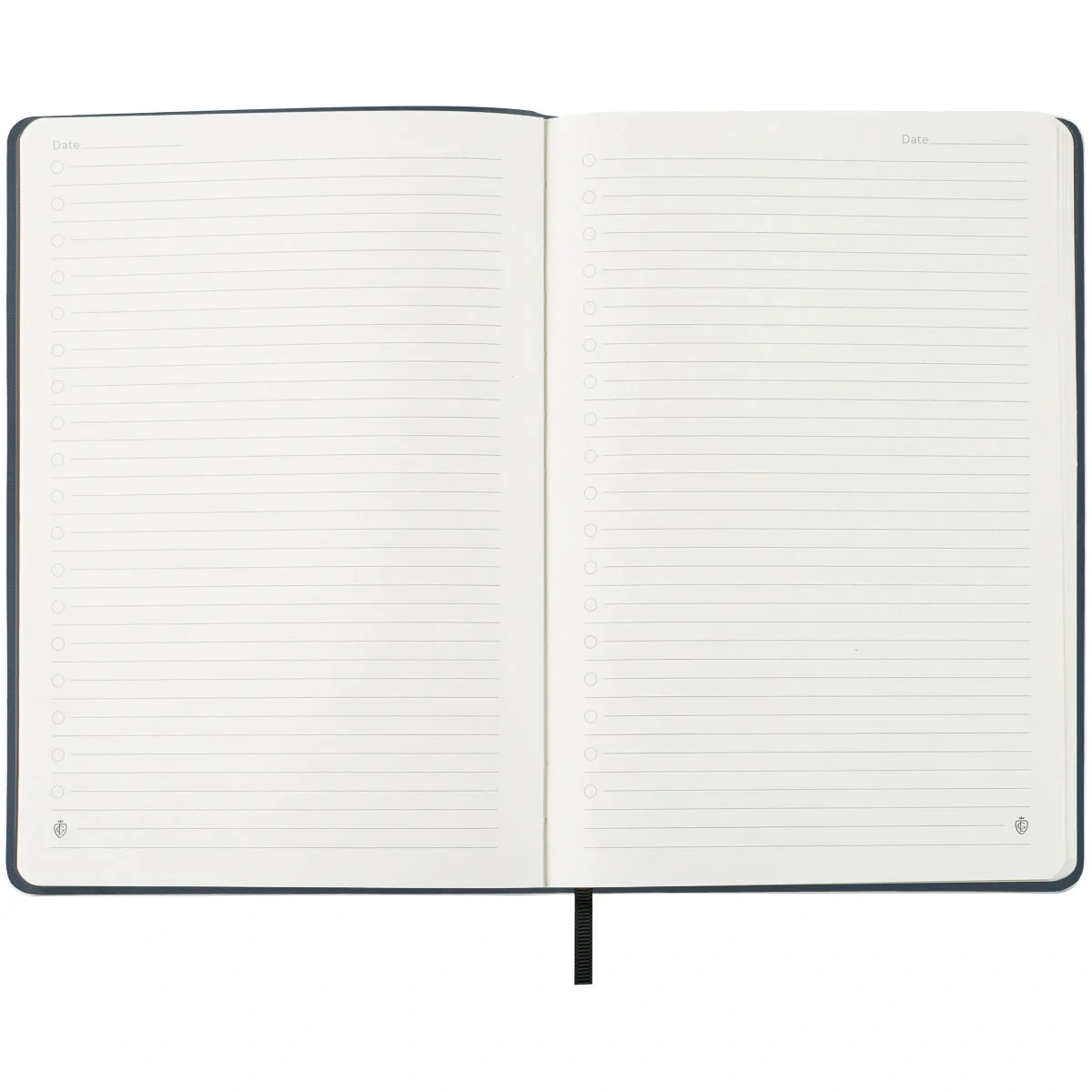 Внутренний блок состоит из 80 листов тонированной бумаги повышенной плотности 80 г/кв.м. Закладка-ляссе позволяет открывать записную книжку сразу на нужной странице. Книжка закрывается на резинку, что дополнительно защищает листы от замятий и загрязнений. Изделие поставляется в индивидуальной упаковке.