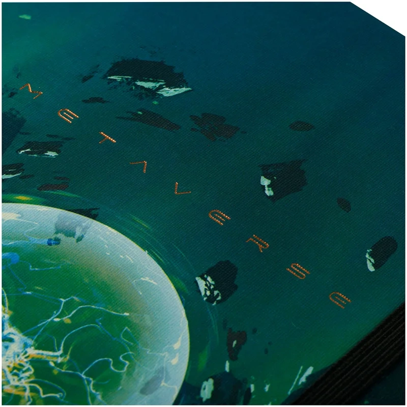Обложка из экокожи с рисунком в футуристическом стиле дополнена фольгированным тиснением. В изделии используется интегральный (лайт) переплёт. Обложка записной книжки лёгкая, но при этом прочная и надёжная.