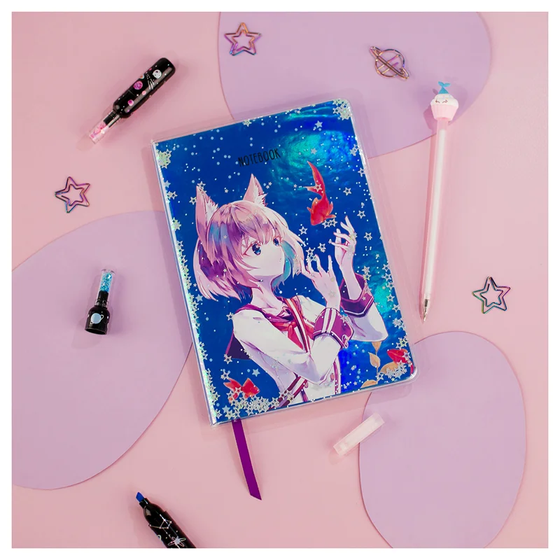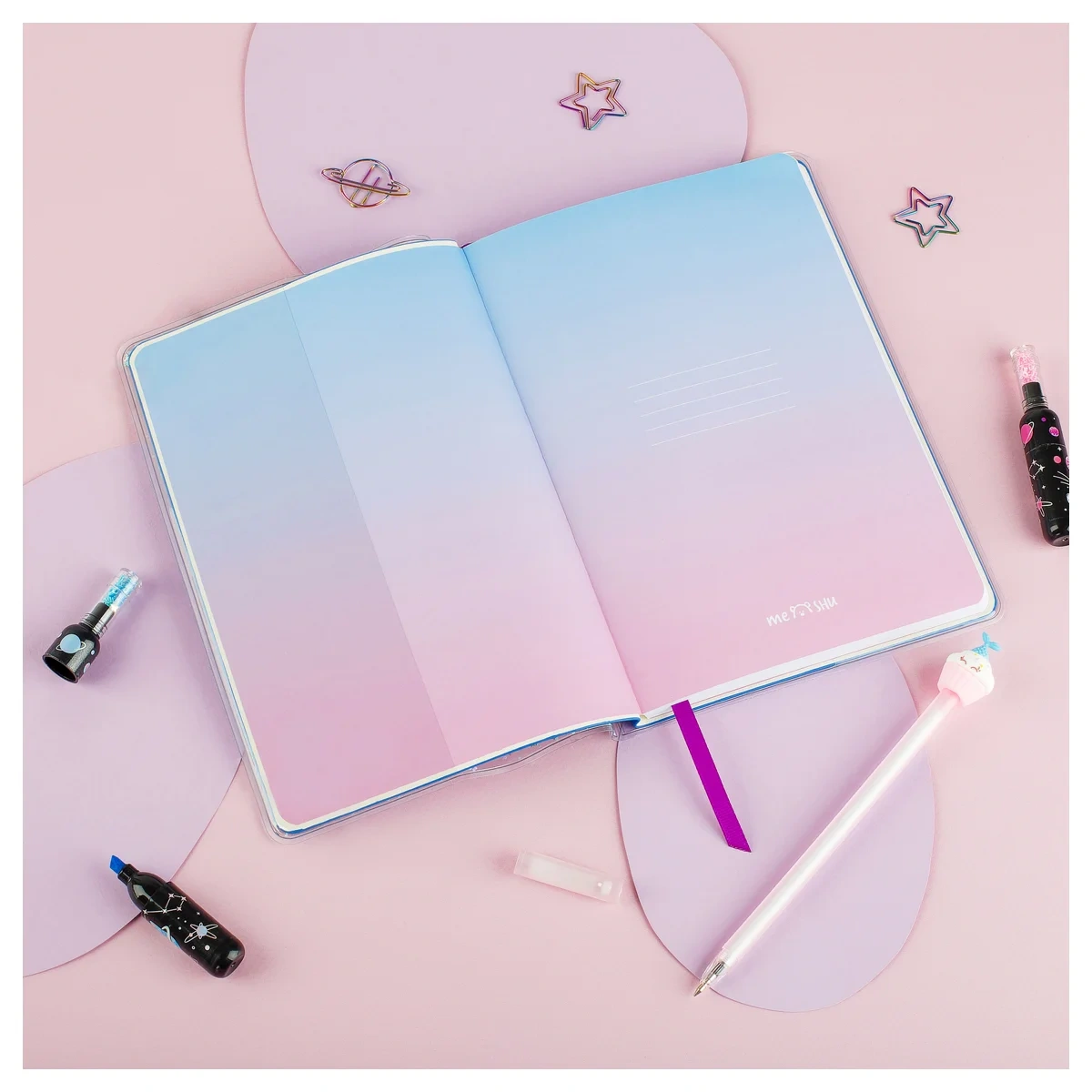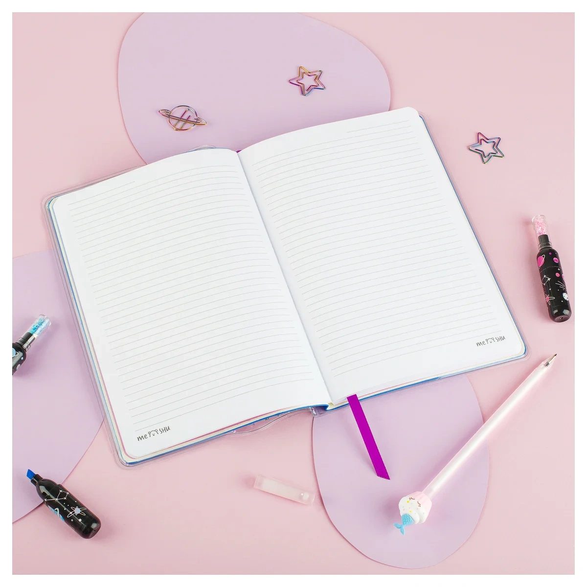 Записная книжка MESHU 'Magic world' формата А5 — помощник в фиксировании срочной информации, ведении личного дневника или ежедневных заметок. Две обложки — из экокожи с голографическим эффектом и съёмная пластиковая — надёжно защищают страницы. Размер — 151*217 мм. Линовка — линия.
