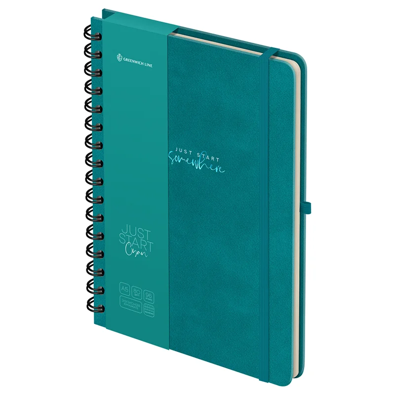 Записная книжка Greenwich Line 'Just start. Cyan' формата А5 — отличный помощник для фиксирования срочной информации, ведении ежедневных заметок. Размер — 143*210 мм. Линовка — клетка.