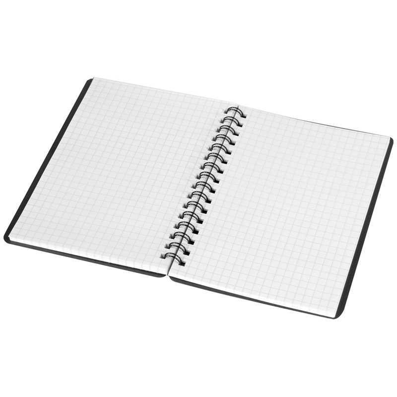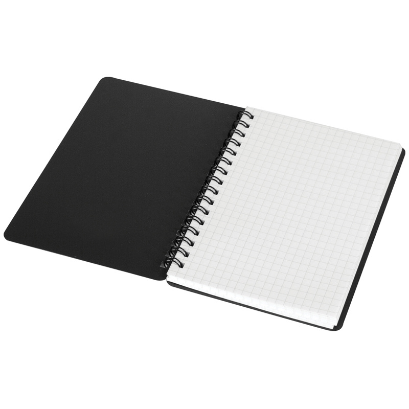 Записная книжка формата А6. Вид крепления -гребень. Обложка -пластиковая. Внутренний блок -офсетный, клетка.
