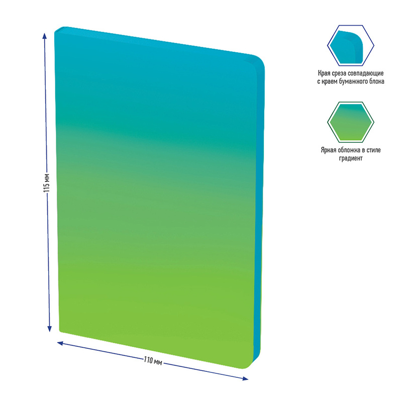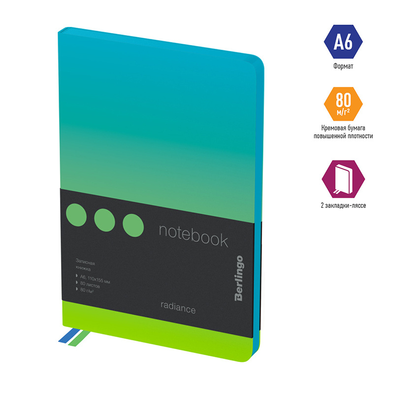 Стильная записная книжка Berlingo Radiance формата А6, несомненно, станет отличным подарком, который подчеркнет индивидуальность обладателя. Мягкая обложка с градиентом зелёно-голубого цвета идеально сочетается с голубым срезом. Прошитый внутренний блок из 80 листов кремовой бумаги повышенной плотности 80 г/м? имеет перфорированные уголки и линовку в клетку. Записная книжка Berlingo Radiance подходит под персонализацию, внутри 2 удобные закладки-ляссе и запечатанные форзацы. В подарок – 3 комплекта стикеров с латинским, русским алфавитом и пиктограммами. Записная книжка представлена в размере 110*155 мм.