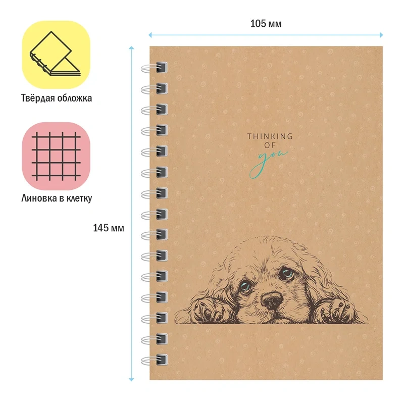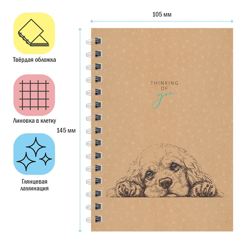 Записная книжка ArtSpace For you формата А6 на гребне – лучший друг для записи важных мыслей и дел. Внутренний блок плотностью 60г/м? состоит из 96 листов офсетной бумаги белого цвета с линовкой в клетку без полей. Записная книжка представлена в размере 100*145 мм. Обложка изготовлена из твёрдого прочного картона с глянцевой ламинацией.