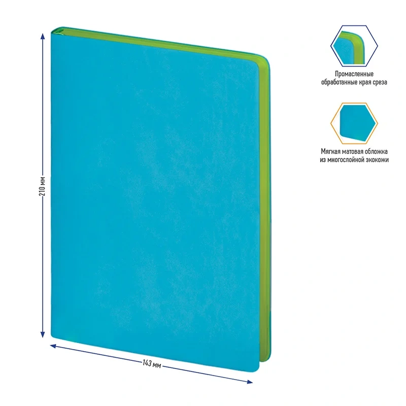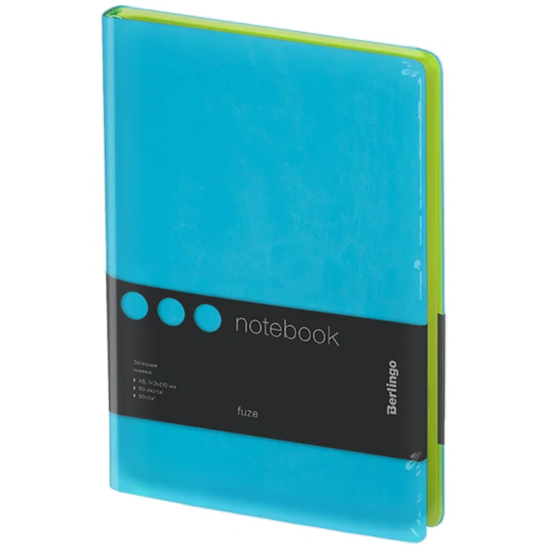 Записная книжка Berlingo Fuze формата A5 с ультрамягкой обложкой – это яркий взгляд на ежедневное планирование. Бирюзовый цвет записной книжки контрастирует с салатовым срезом. Прошитый внутренний блок из 80 листов кремовой бумаги повышенной плотности 80 г/м? имеет перфорированные уголки и линовку в клетку. Записная книжка Berlingo Fuze подходит под персонализацию, внутри 2 удобные закладки-ляссе. В подарок – 3 комплекта стикеров с латинским, русским алфавитом и пиктограммами. Записная книжка представлена в размере 143*210 мм.