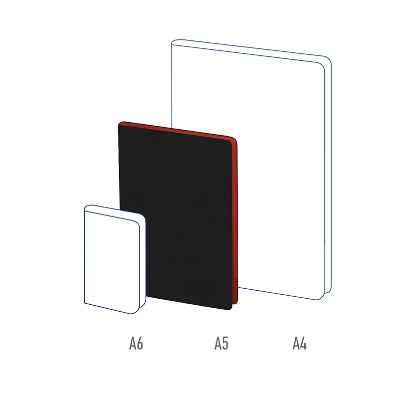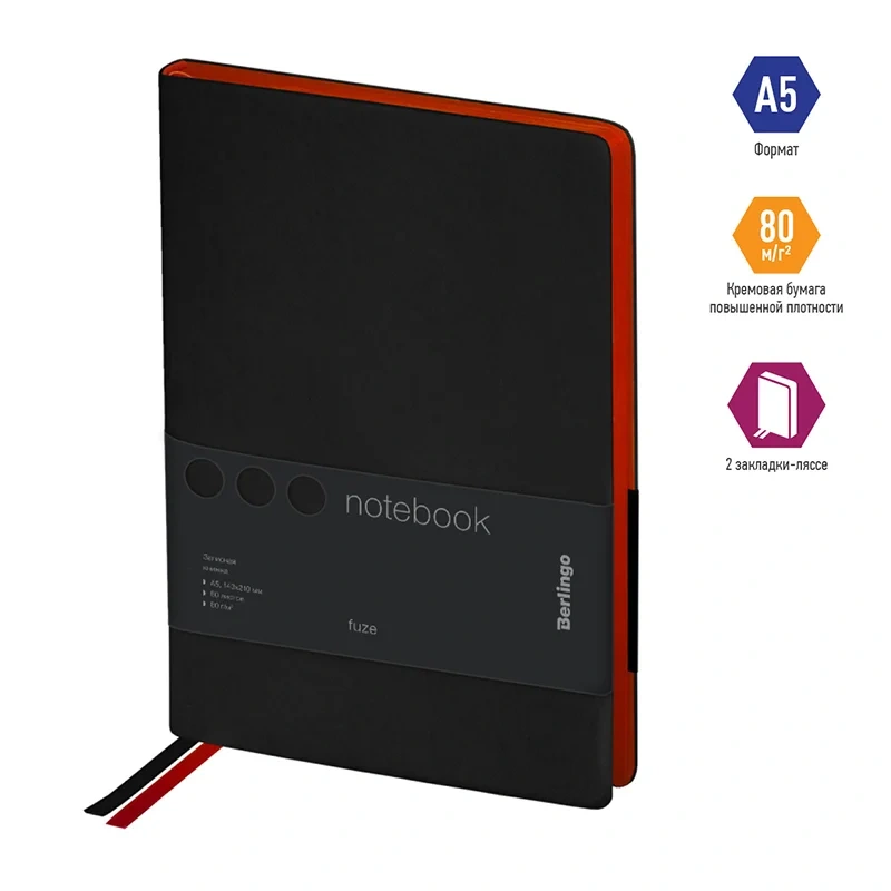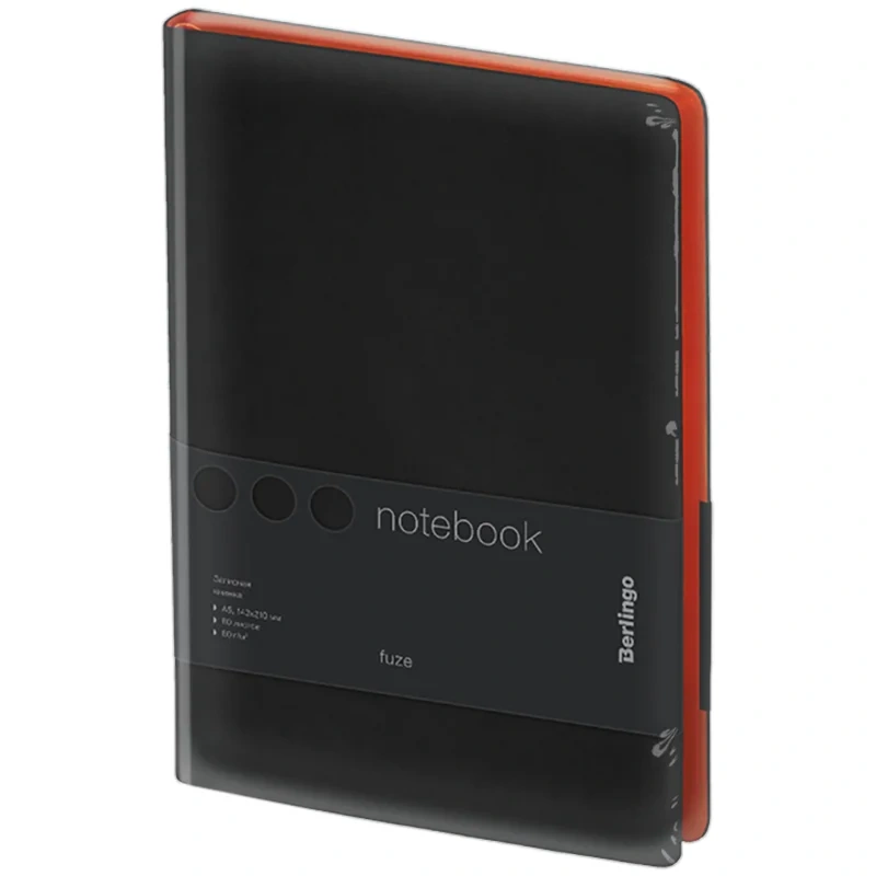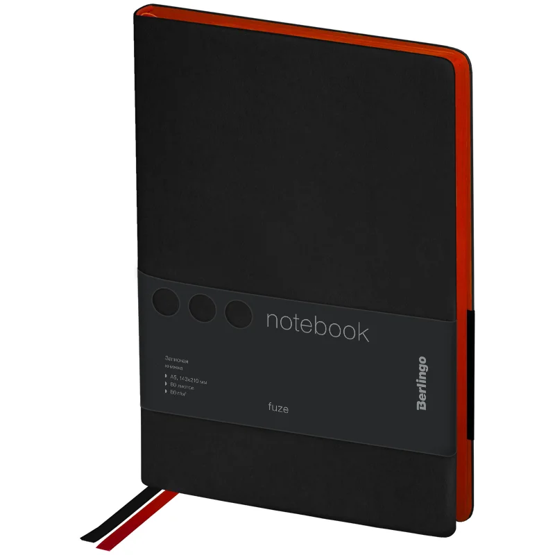 Записная книжка Berlingo Fuze формата A5 с ультрамягкой обложкой из двух слоев высококачественной экокожи – это яркий взгляд на ежедневное планирование. Обложка чёрного цвета сочетается с красным срезом. Прошитый внутренний блок из 80 листов кремовой бумаги повышенной плотности 80 г/м? имеет перфорированные уголки и линовку в клетку. Записная книжка Berlingo Fuze подходит под персонализацию, внутри 2 удобные закладки-ляссе. В подарок – 3 комплекта стикеров с латинским, русским алфавитом и пиктограммами. Записная книжка представлена в размере 143*210 мм.