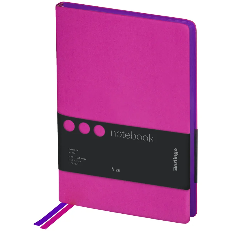 Записная книжка Berlingo Fuze формата A5 с ультрамягкой обложкой из двух слоев высококачественной экокожи – это яркий взгляд на ежедневное планирование. Обложка цвета фуксии сочетается с фиолетовым срезом. Прошитый внутренний блок из 80 листов кремовой бумаги повышенной плотности 80 г/м? имеет перфорированные уголки и линовку в клетку. Записная книжка Berlingo Fuze подходит под персонализацию, внутри 2 удобные закладки-ляссе. В подарок – 3 комплекта стикеров с латинским, русским алфавитом и пиктограммами. Записная книжка представлена в размере 143*210 мм.
