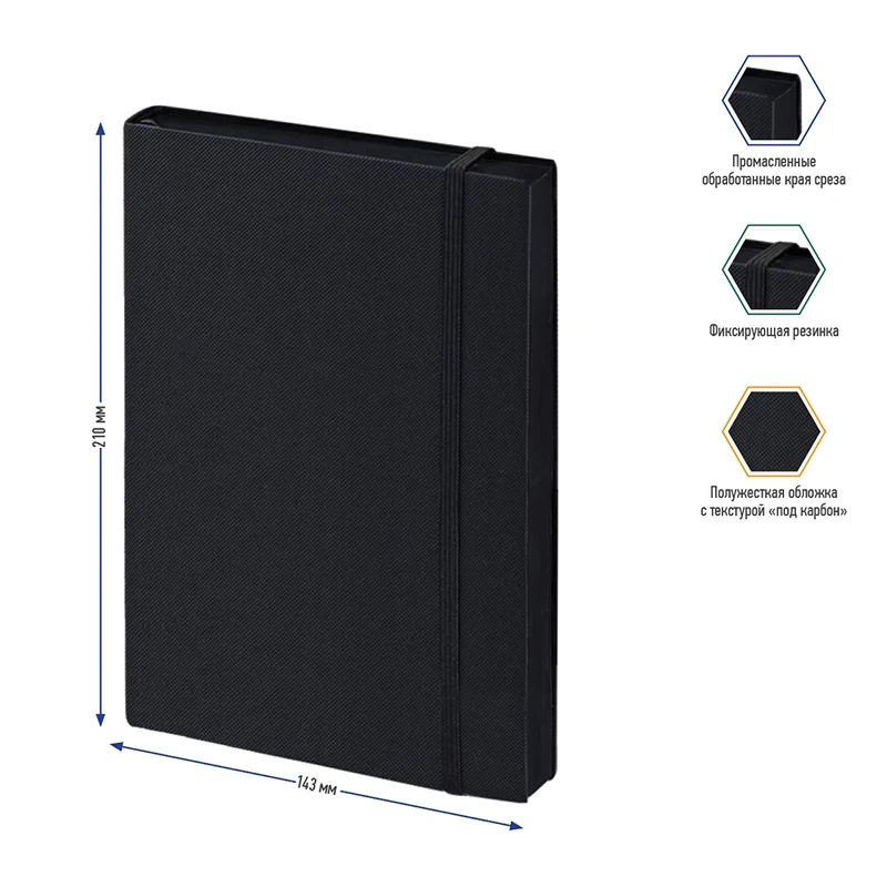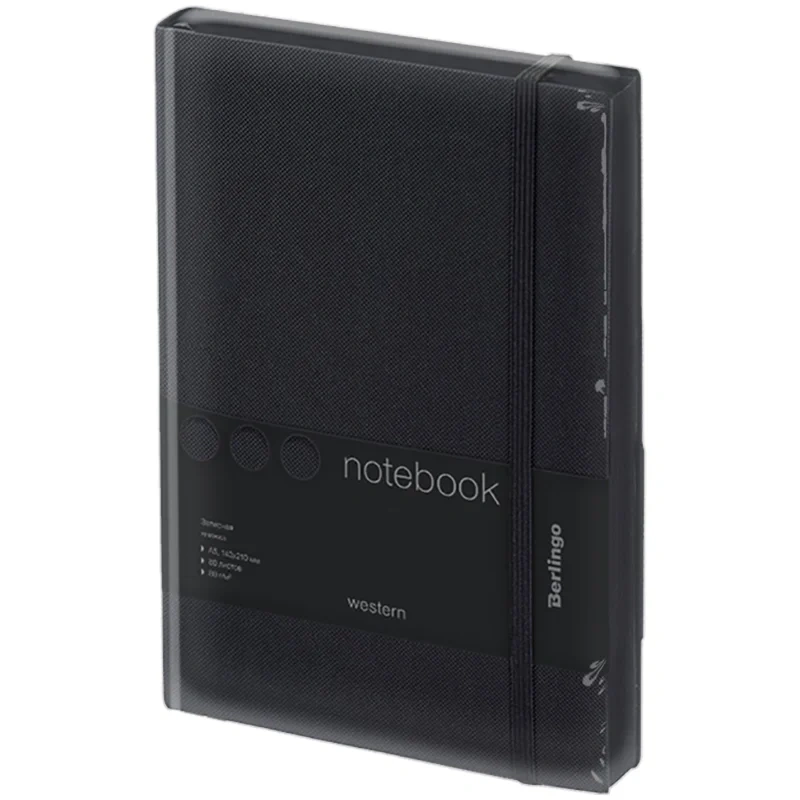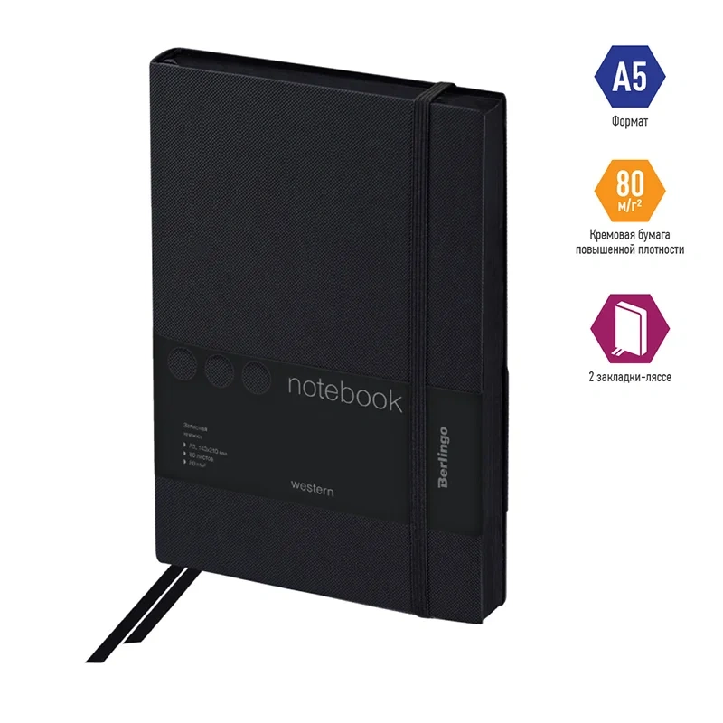 Записная книжка Berlingo Western формата А5 с полужесткой обложкой и стильным тиснением под карбон – идеальный подарок для деловых людей. Чёрный строгий цвет обложки сочетается с чёрным срезом. Прошитый внутренний блок из 80 листов кремовой бумаги повышенной плотности 80 г/м? имеет перфорированные уголки и линовку в клетку. Записная книжка Berlingo Western подходит под персонализацию, внутри 2 удобные закладки-ляссе. В подарок – 3 комплекта стикеров с латинским, русским алфавитом и пиктограммами. Записная книжка представлена в размере 143*210 мм.